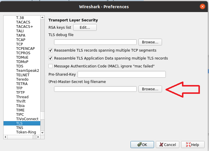 To use the TLS keys to decrpyt this traffic, go to Edit >> Preferences >> Protocols, and scroll down to get TLS. In the last field in the windows, you’l see “Pre-MasterSecret log filename”, click on “Browse…” next to it, and show Wireshark the location of the tlskeys.log file. Then, click “OK”.