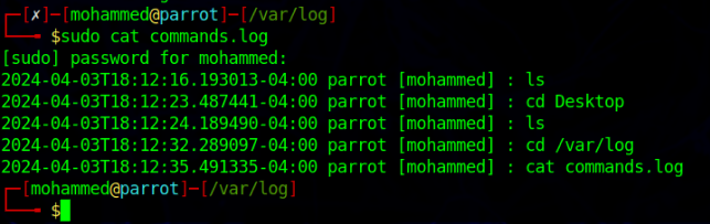 Close all open bash shell sessions, and start a new one. All of the commands types now will be captured in /var/log/commands.log file.